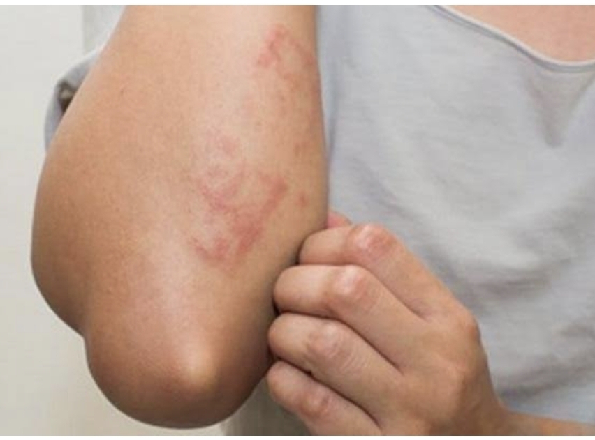طفحًا من النتوءات الحمراء أو الأرجوانية المائلة للحمرة تقع عادةً على قصبة الساق أو الكاحل، وقد تكون دافئة ذات ملمس طري