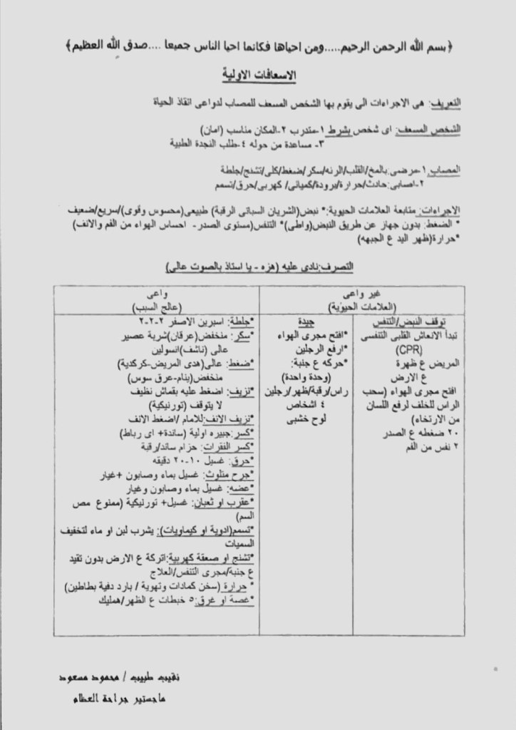 قم بالاسعافات الأولية التالية حسب العرض وتوجه حالا لاقرب مستشفى قسم الطوارئ